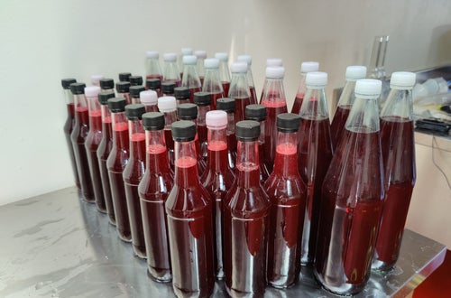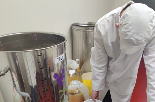 Gärvorbereitung für eine Mischung aus Apfelsaft und Indianerbananenpüree und ganz nebenbei 30l Sirup für die Mensa gemacht