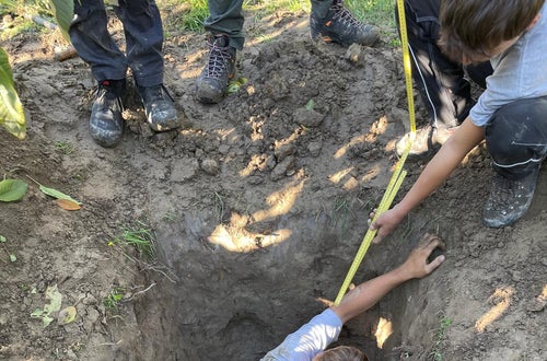 Um ein Bodenprofil zu erfassen, wird in der Regel ein Bodenaufschluss, also ein Graben oder eine Bodenbohrung, angelegt. Im Obstbau empfiehlt es sich, einen Profilgraben von etwa einem Meter Tiefe auszuheben, damit alle wichtigen Horizonte sichtbar werden. Die freigelegte Wand zeigt die verschiedenen Schichten, die sich durch Farbe, Struktur und Zusammensetzung unterscheiden lassen.
