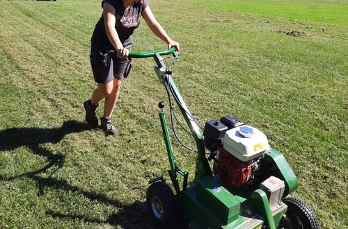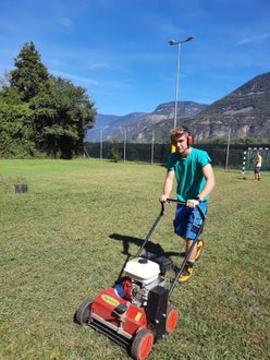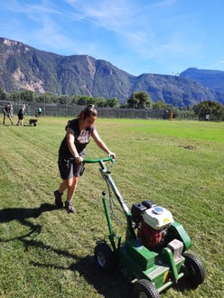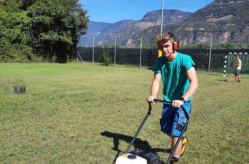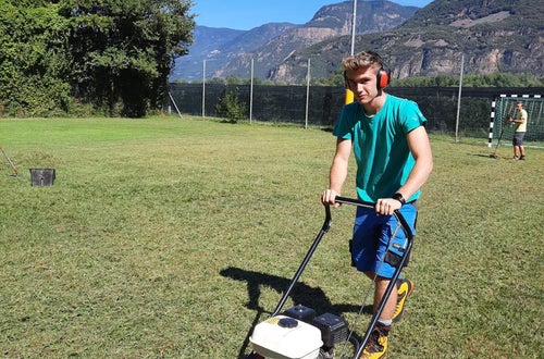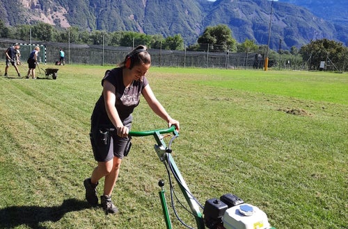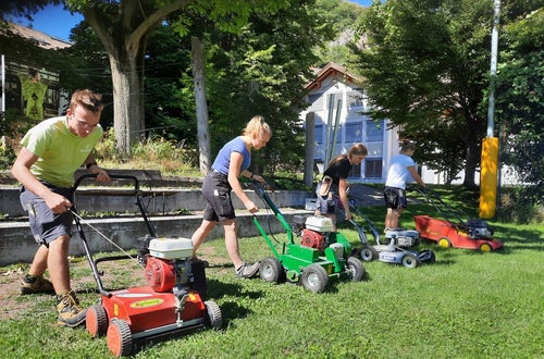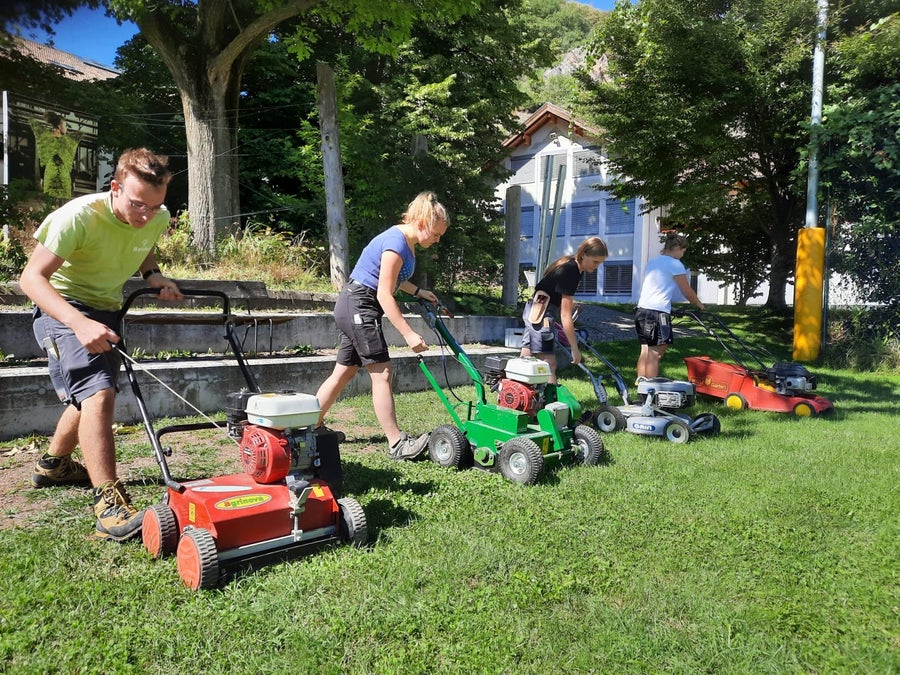 Innerhalb der Praxis Gartenbau erlernen die jungen Schüler*innen der Ausbildung Gartenbau/Floristik die Kniffe rund um die Rasenpflege.