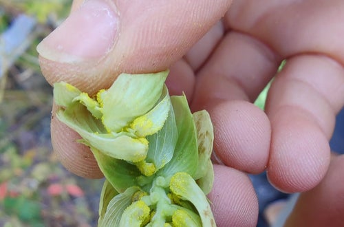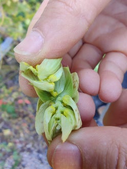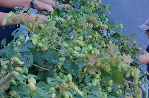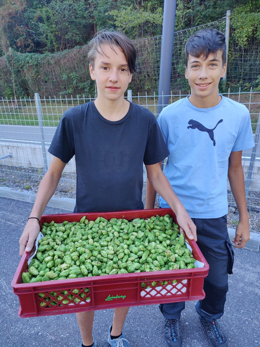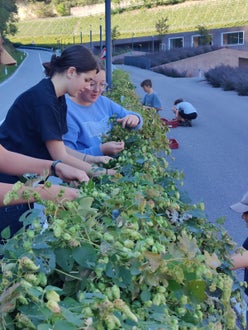 Ernte des schuleigenen Hopfens als Basis für die zukünftigen Brautage in der Lebensmitteltechnik. Herrliche Aromen nach Pfeffer, tropischen Früchten, Zitrone