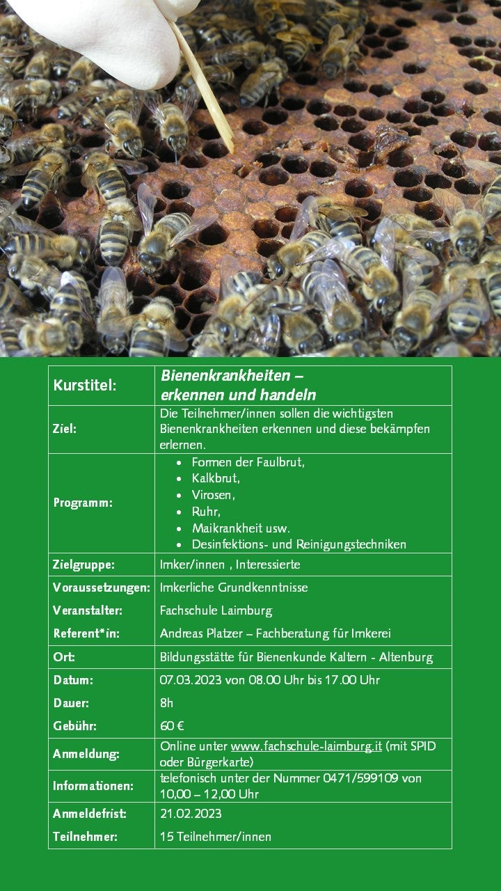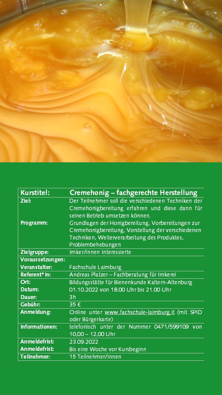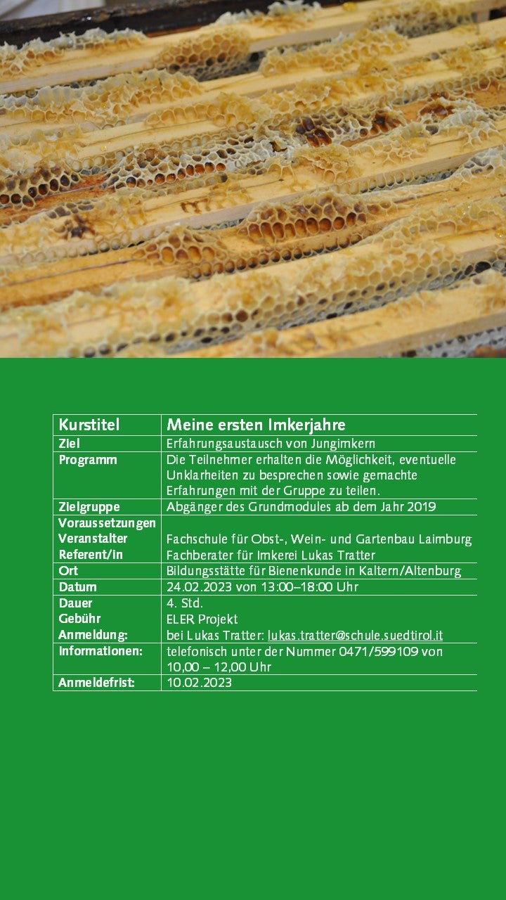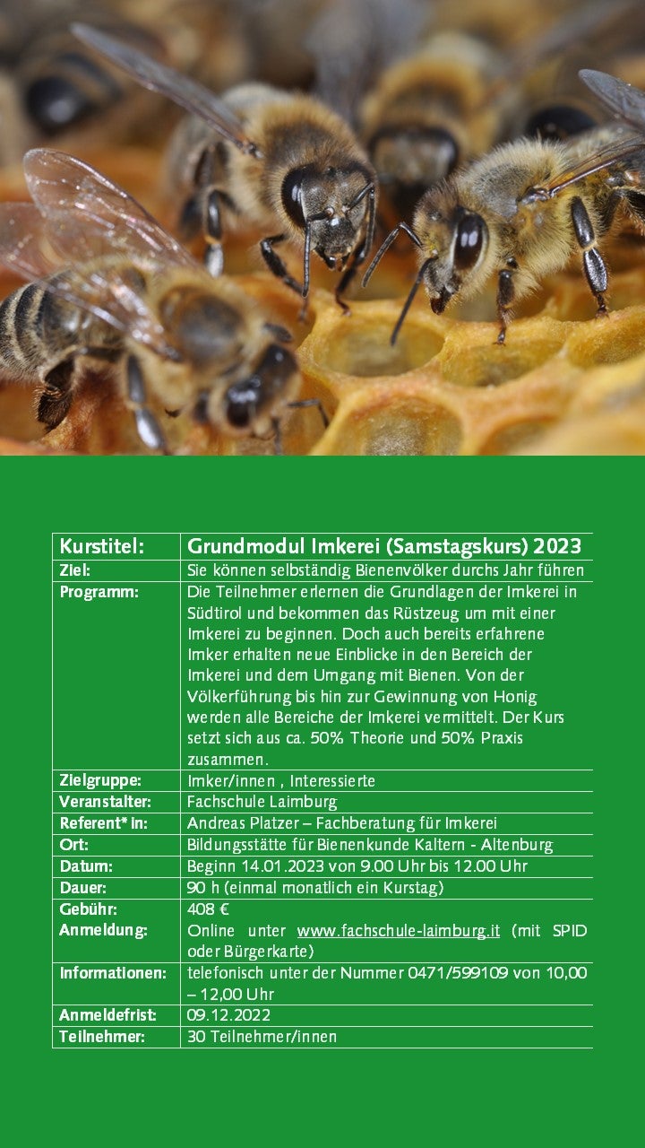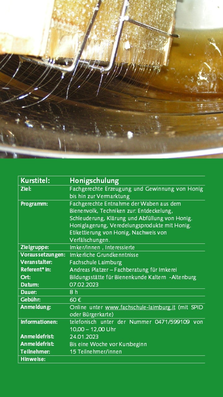 Weiterbildung Imkerei 30.05.2022 | News Ab September 2022 bieten wir wieder interessante Kurse zur Imkerei an. Die Anmeldung ist erst ab 01.09.2022 mit SPID oder Bürgerkarte möglich. Bildergalerie Weiterbildungskurse 22-23 - Anmeldung ab 01.09.22 möglich