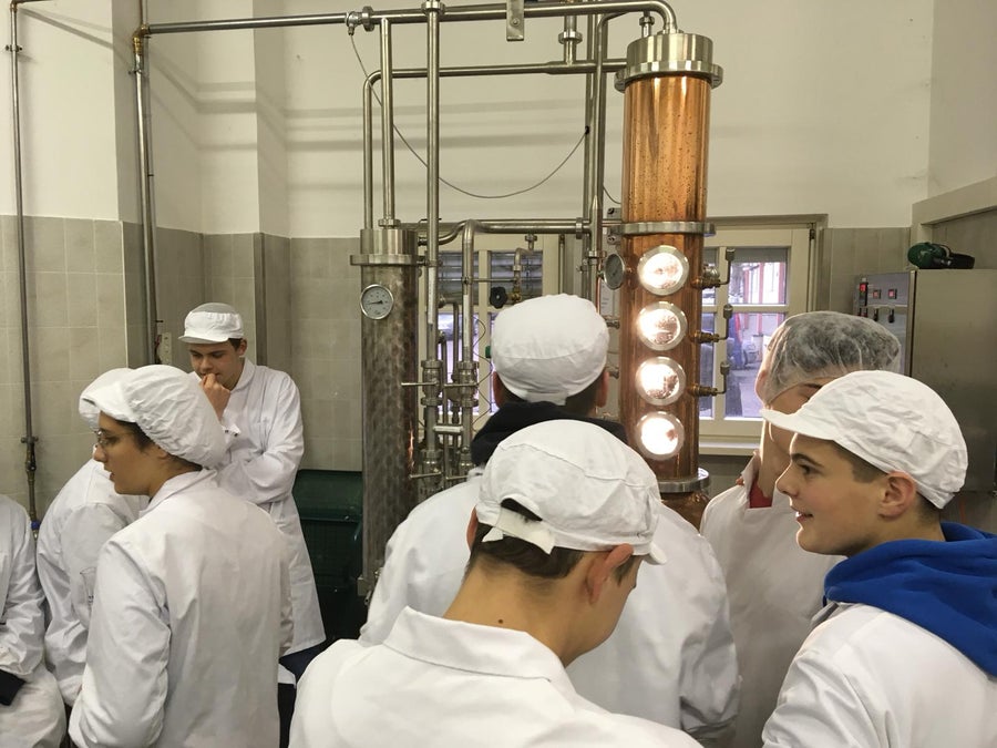 Destillation: Technik trifft Präzision: Die Destillation bleibt der zentrale Prozessschritt: Hier wird der zuvor durch Gärung entstandene Alkohol aus der Fruchtmaische extrahiert. Unsere Schülerinnen und Schüler lernen, die verschiedenen Fraktionen – Vorlauf, Mittellauf und Nachlauf – gezielt zu trennen. Präzise Messungen des Alkoholgehaltes und eine kontrollierte Temperaturführung garantieren höchste Qualität.